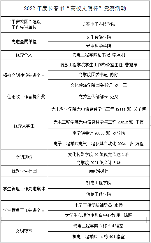 我校2022年度長(zhǎng)春市“高校文明杯”競(jìng)賽活動(dòng)獲獎(jiǎng)名單
