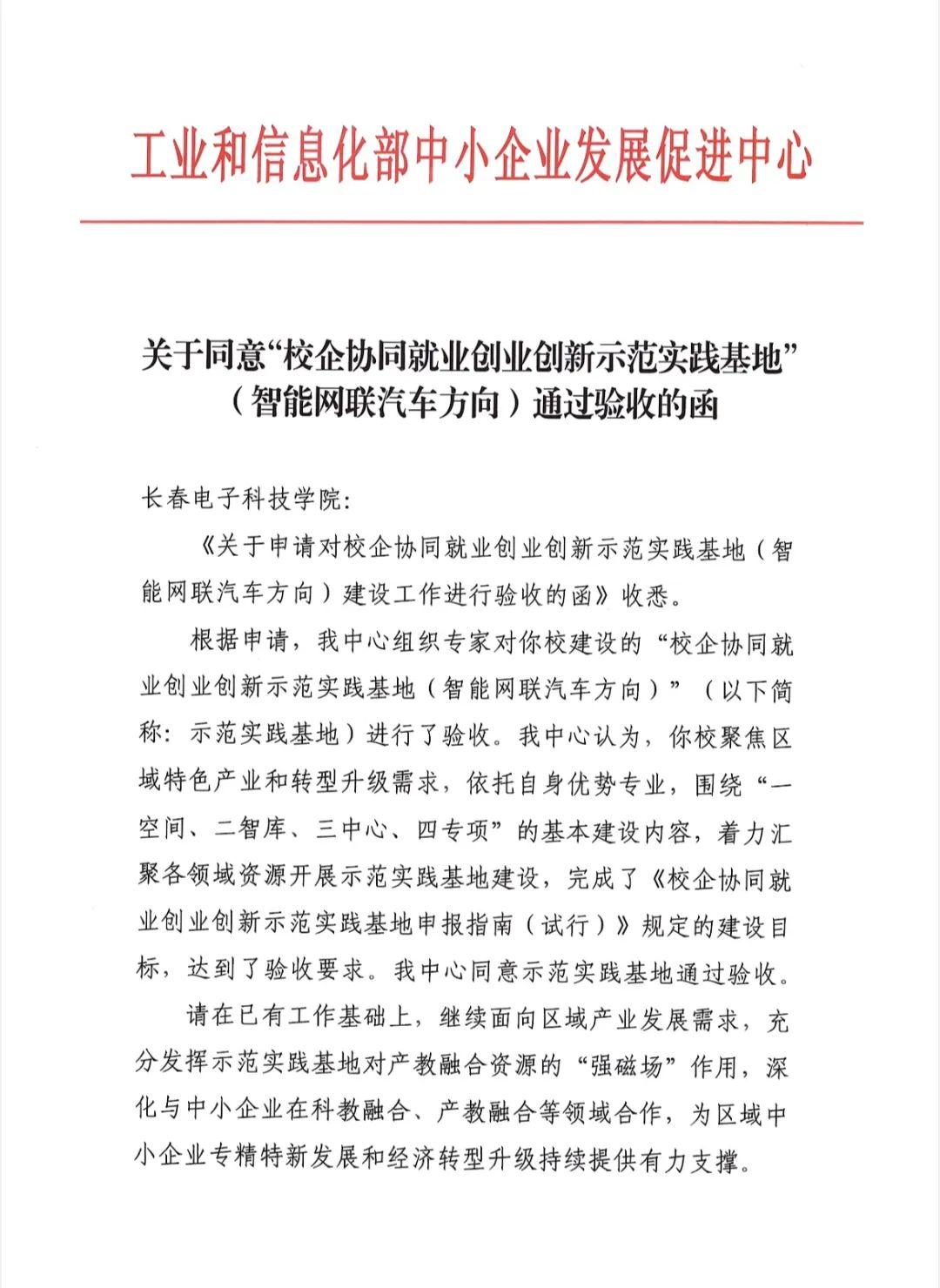 日前,國家工信部中小企業(yè)發(fā)展促進(jìn)中心致函我校:長春電子科技學(xué)院“校企協(xié)同就業(yè)創(chuàng)業(yè)創(chuàng)新示范實(shí)踐基地(智能網(wǎng)聯(lián)汽車方向)”(以下簡稱“示范實(shí)踐基地”)項(xiàng)目按照《校企協(xié)同就業(yè)創(chuàng)業(yè)創(chuàng)新示范實(shí)踐基地申報(bào)指南(試行)》規(guī)定的建設(shè)目標(biāo),達(dá)到了驗(yàn)收要求。同意示范實(shí)踐基地通過驗(yàn)收。