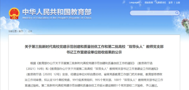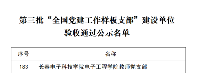 近日,教育部公布了第三批新時代高校黨建示范創(chuàng)建和質量創(chuàng)優(yōu)工作和第二批高校“雙帶頭人”教師黨支部書記工作室建設單位的驗收結果的公示,我校電子工程學院教師黨支部順利通過了此次驗收,成為“全國黨建工作樣板支部”,標志著我校基層黨建工作邁上了新的臺階。