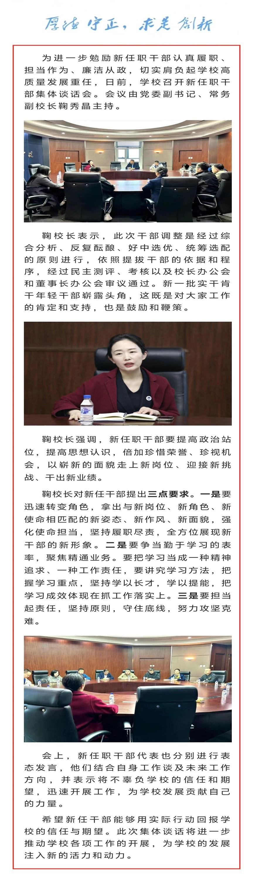 為進一步勉勵新任職干部認真履職、擔當作為、廉潔從政,切實肩負起學校高質量發(fā)展重任,日前,學校召開新任職干部集體談話會。會議由黨委副書記、常務副校長鞠秀晶主持。 鞠校...