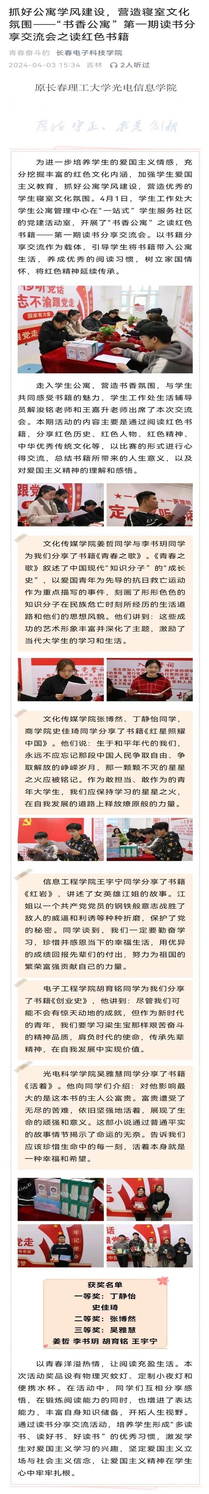為進(jìn)一步培養(yǎng)學(xué)生的愛(ài)國(guó)主義情感,充分挖掘豐富的紅色文化內(nèi)涵,加強(qiáng)學(xué)生愛(ài)國(guó)主義教育,抓好公寓學(xué)風(fēng)建設(shè),營(yíng)造優(yōu)秀的學(xué)生寢室文化氛圍。4月1日,學(xué)生工作處大學(xué)生公寓管理中...