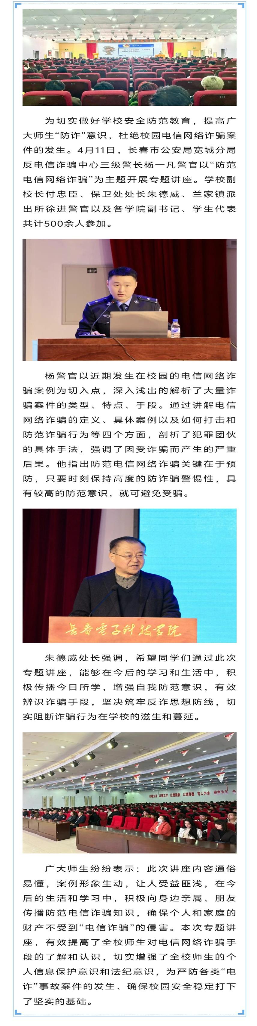 為切實(shí)做好學(xué)校安全防范教育,提高廣大師生防詐意識(shí),杜絕校園電信網(wǎng)絡(luò)詐騙案件的發(fā)生。4月11日,長(zhǎng)春市公安局寬城分局反電信詐騙中心三級(jí)警長(zhǎng)楊一凡警官以防范電信網(wǎng)絡(luò)詐騙為...