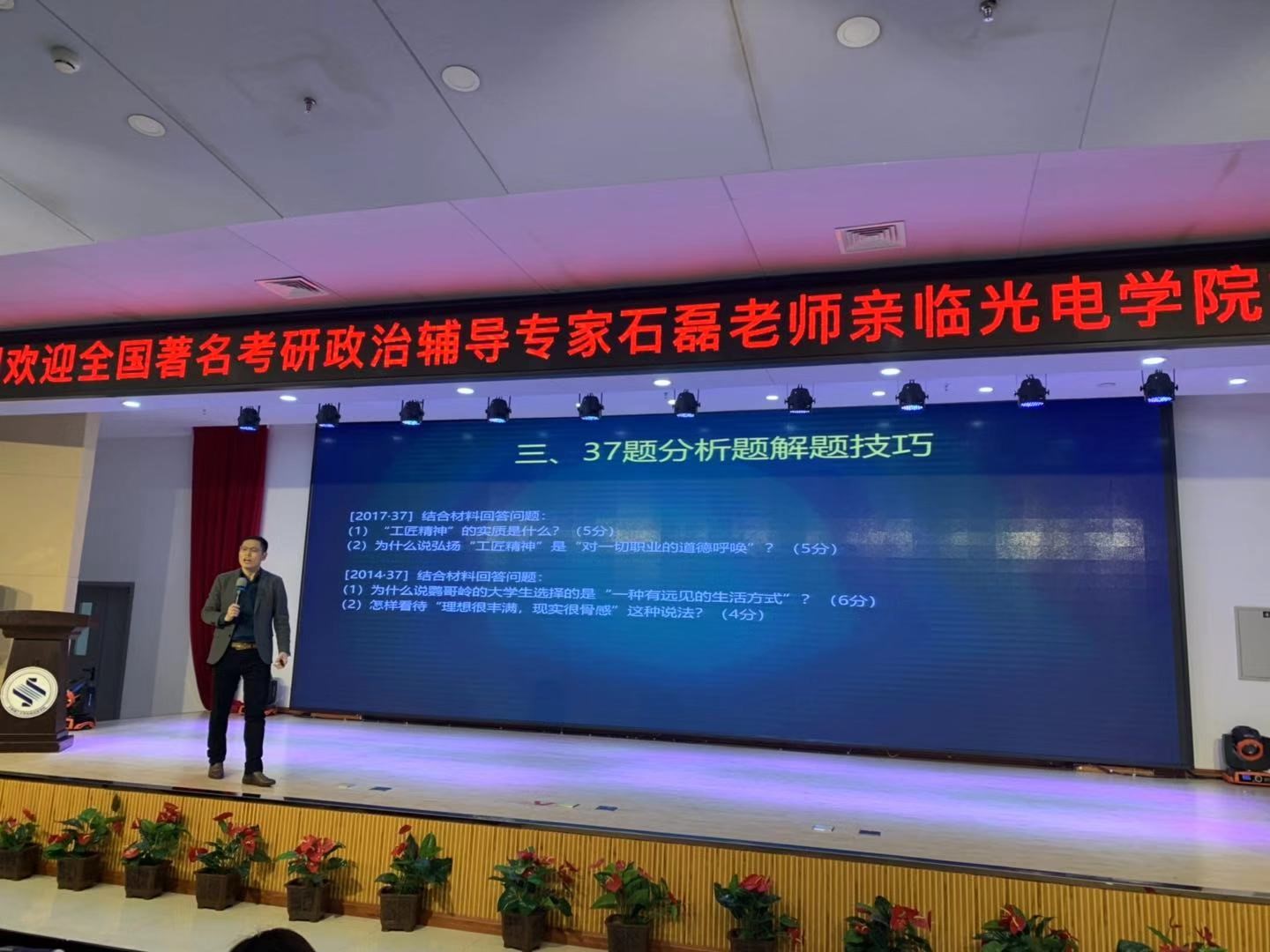 為幫助我院學(xué)生更好的了解考研形勢(shì)及命題規(guī)律,有效提高考生考研升學(xué)率,學(xué)院與吉林省最大、師資力量最強(qiáng)的“爭(zhēng)流”考研培訓(xùn)學(xué)校開展了名師進(jìn)校園系列活動(dòng)。3月6日14時(shí),在圖書館報(bào)告廳,全國(guó)考研政治輔導(dǎo)專家石磊親臨光電信息學(xué)院,舉辦“2020年全國(guó)碩士研究生招生考試思想政治理論考試”的學(xué)術(shù)報(bào)告會(huì)。