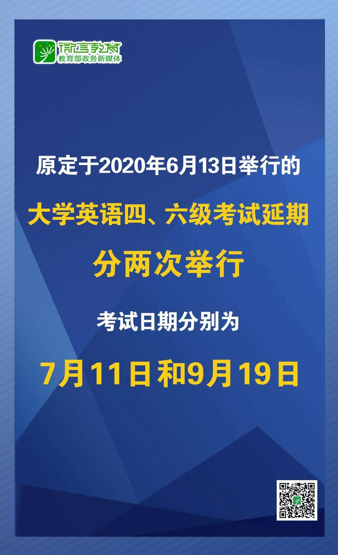 根據(jù)黨中央、國務(wù)院關(guān)于新冠肺炎疫情防控工作的有關(guān)精神,經(jīng)研究決定,原定于2020年6月13日舉行的全國大學(xué)英語四、六級考試延期并分兩次舉行,考試日期分別為7月11日和9月19日。各高??梢愿鶕?jù)復(fù)學(xué)復(fù)課實(shí)際情況及當(dāng)?shù)匦l(wèi)生防疫要求向省級考試機(jī)構(gòu)提出考試申請,經(jīng)批準(zhǔn)后,組織一次或者兩次考試。同一考生同一級別只能選擇參加一次考試。具體報(bào)名時間以各省級考試機(jī)構(gòu)公布為準(zhǔn)。