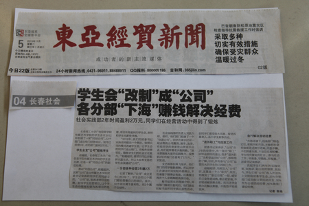 長春理工大學(xué)廣電信息學(xué)院傳媒藝術(shù)學(xué)院的學(xué)生會在2012年組建了一家“同創(chuàng)公司”,12個部門走出校門經(jīng)營項(xiàng)目。如今已經(jīng)營2年,有的部門盈利2萬元。