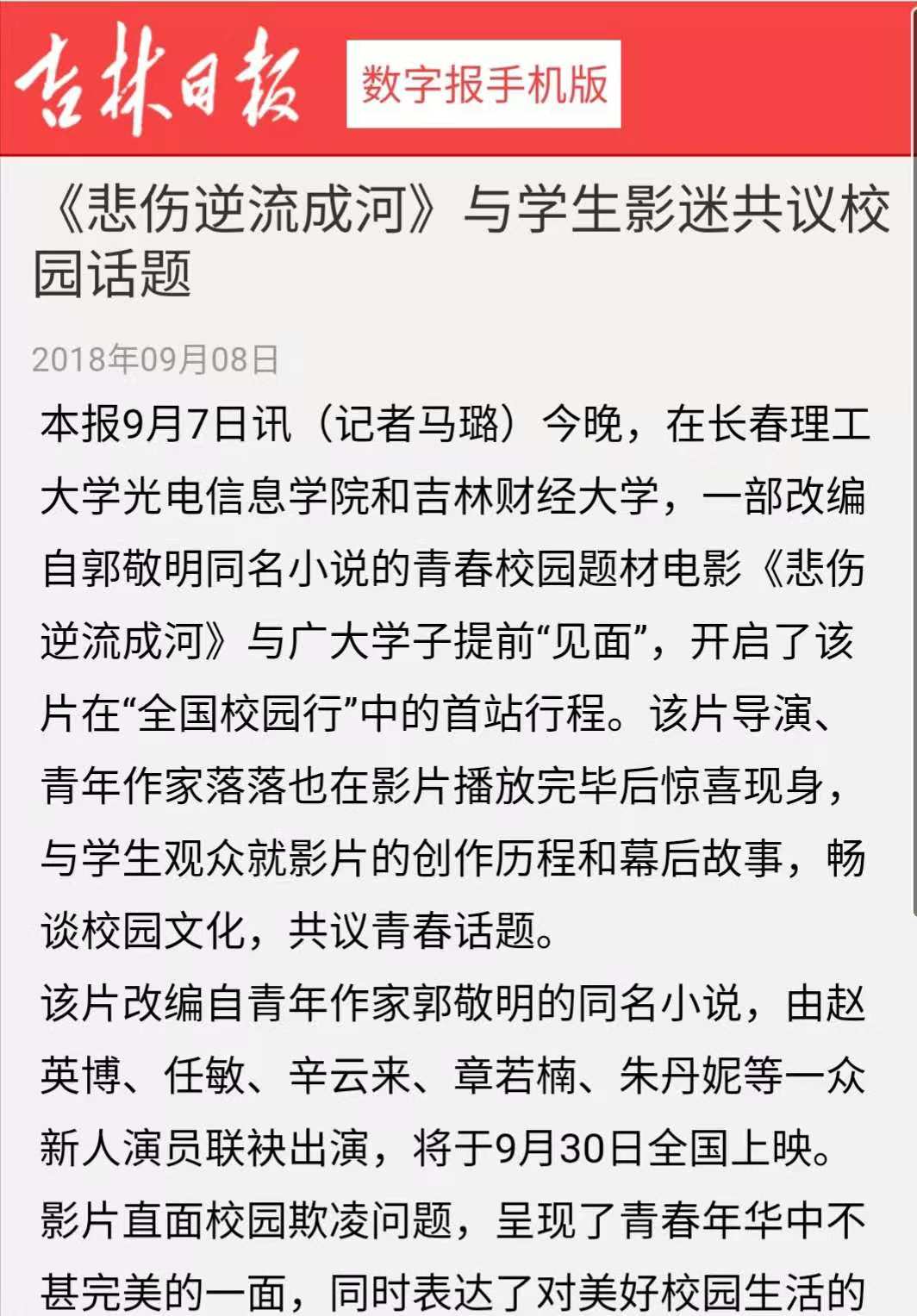 【吉林日?qǐng)?bào)】《悲傷逆流成河》與學(xué)生影迷公議校園話題