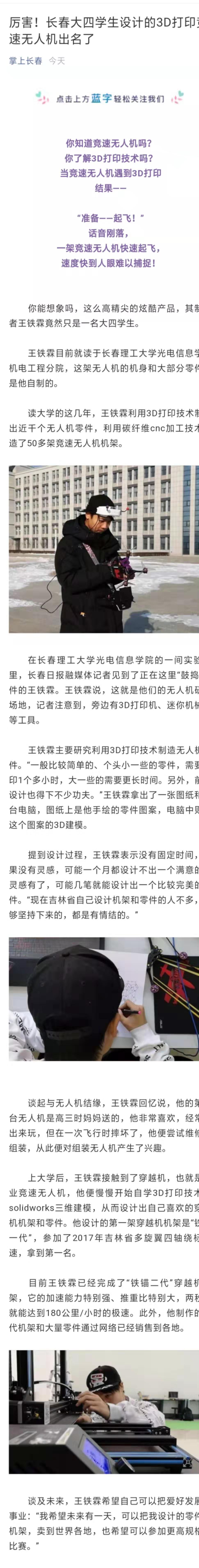 【長(zhǎng)春日?qǐng)?bào)】厲害!長(zhǎng)春大四學(xué)生設(shè)計(jì)的3D打印競(jìng)速無(wú)人機(jī)出名了