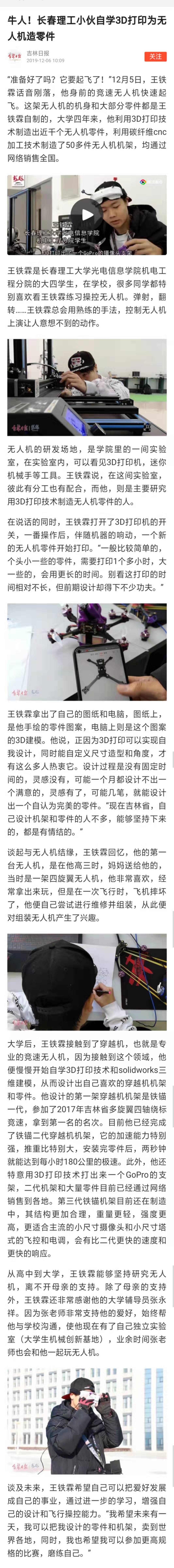 【看點(diǎn)快報(bào)】牛人!長(zhǎng)春理工小伙自學(xué)3D打印為無(wú)人機(jī)造零件