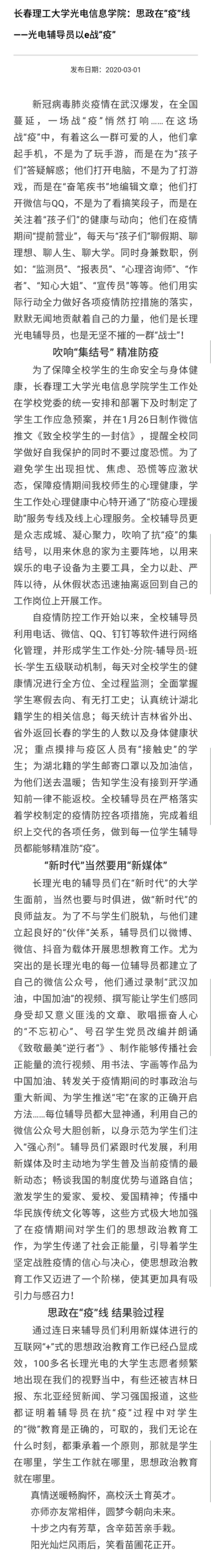【吉林省高校思想政治工作網(wǎng)】長(zhǎng)春理工大學(xué)光電信息學(xué)院:思政在“疫”線——光電輔導(dǎo)員以e戰(zhàn)“疫”