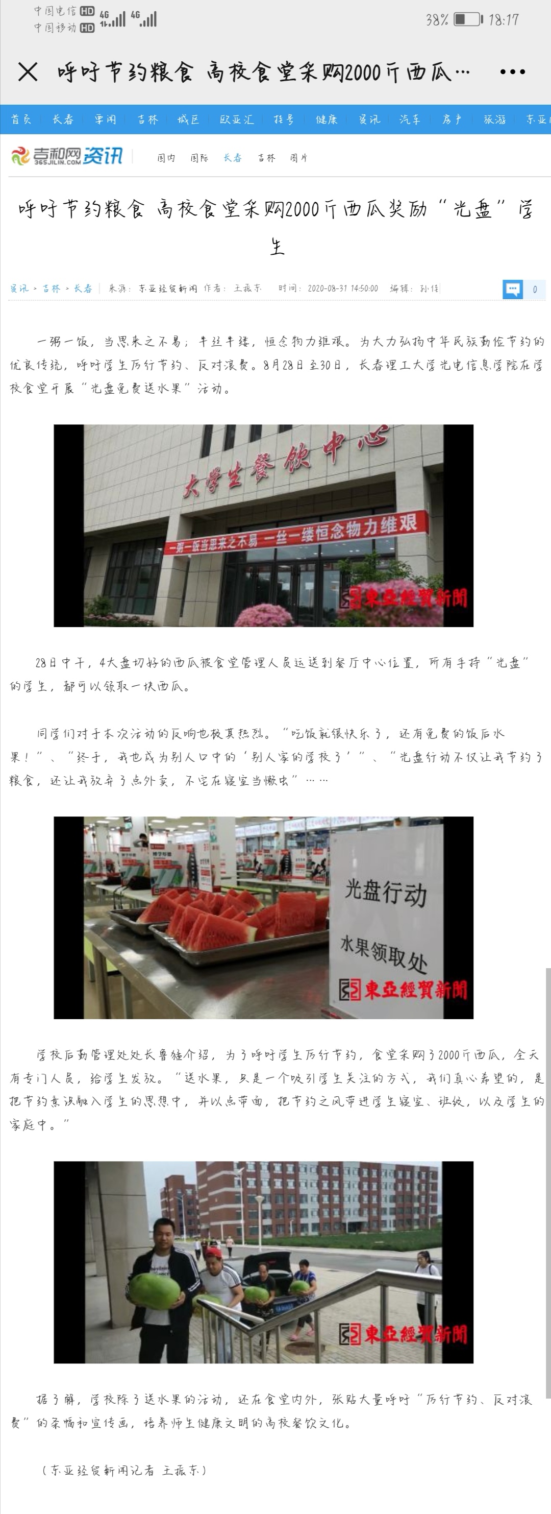 【東亞經(jīng)貿(mào)新聞】呼吁節(jié)約糧食,高校食堂采購2000斤西瓜獎勵‘光盤’學(xué)生