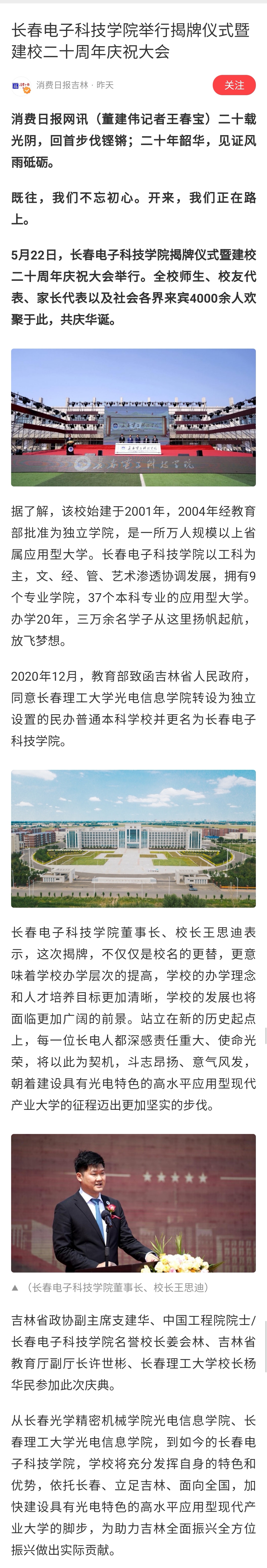 【消費日報吉林】長春電子科技學院舉行揭牌儀式暨建校二十周年慶祝大會