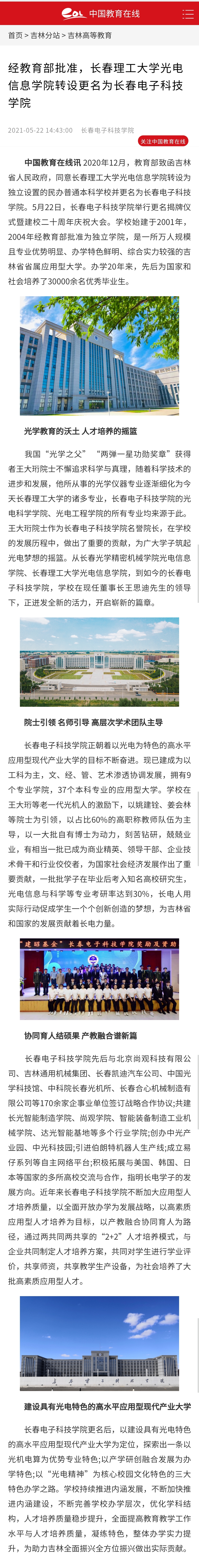 【中國教育在線】經(jīng)教育部批準,長春理工大學光電信息學院轉設更名為長春電子科技學院