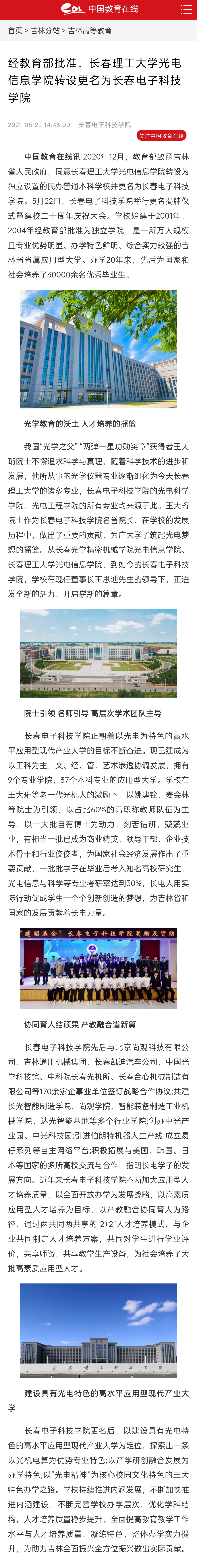 【中國(guó)教育在線】經(jīng)教育部批準(zhǔn),長(zhǎng)春理工大學(xué)光電信息學(xué)院轉(zhuǎn)設(shè)更名為長(zhǎng)春電子科技學(xué)院