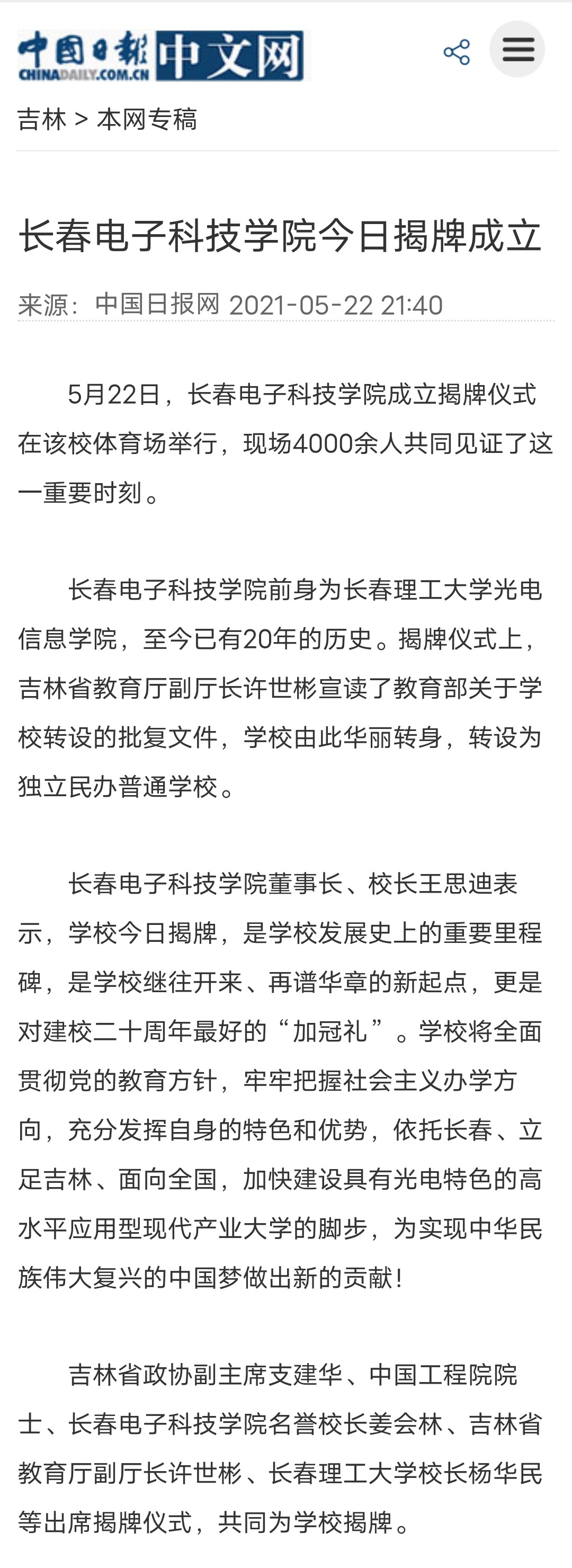 【中國(guó)日?qǐng)?bào)網(wǎng)】長(zhǎng)春電子科技學(xué)院今日揭牌成立