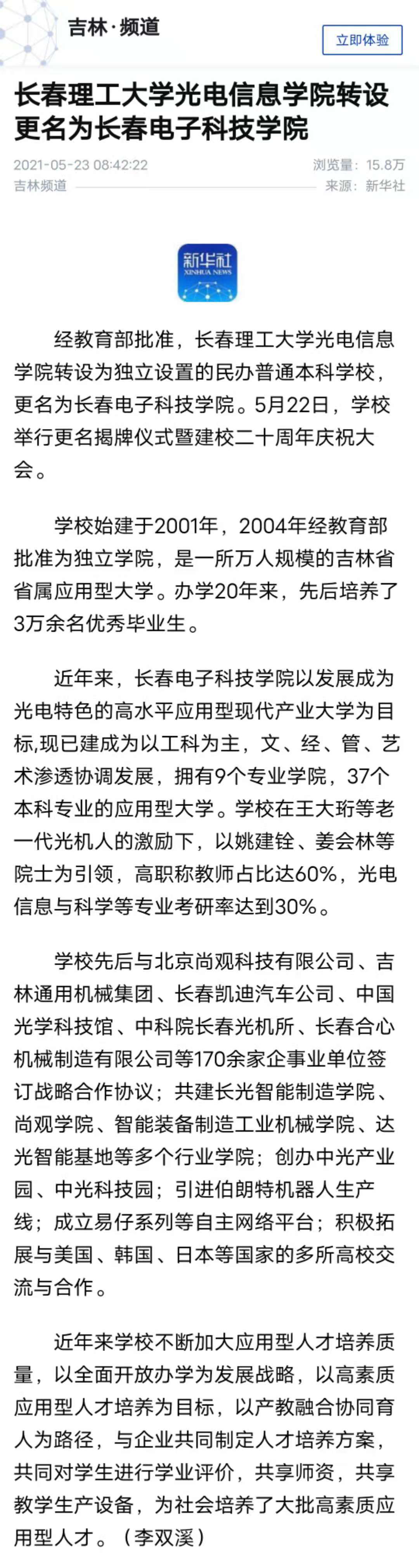 【吉林?頻道】長春理工大學光電信息學院轉設更名為長春電子科技學院