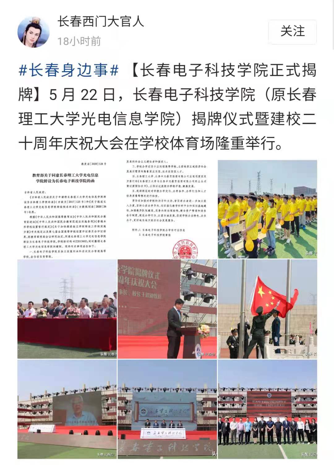 【長春西門大官人】【長春電子科技學(xué)院正式揭牌】5月22日,長春電子科技學(xué)院(原長春理工大學(xué)光電信息學(xué)院)揭牌儀式暨建校二十周年慶祝大會在學(xué)校
