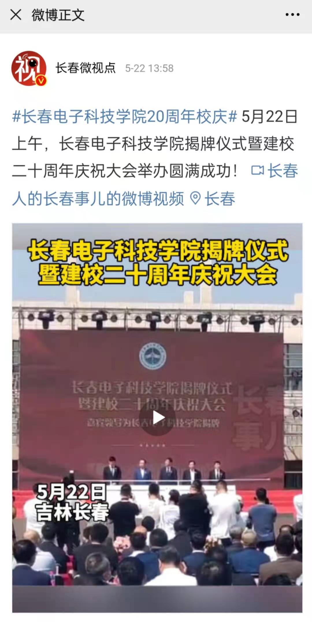 【長(zhǎng)春微視點(diǎn)】5月22日上午,長(zhǎng)春電子科技學(xué)院揭牌儀式暨建校20周年慶祝大會(huì)舉辦圓滿成功