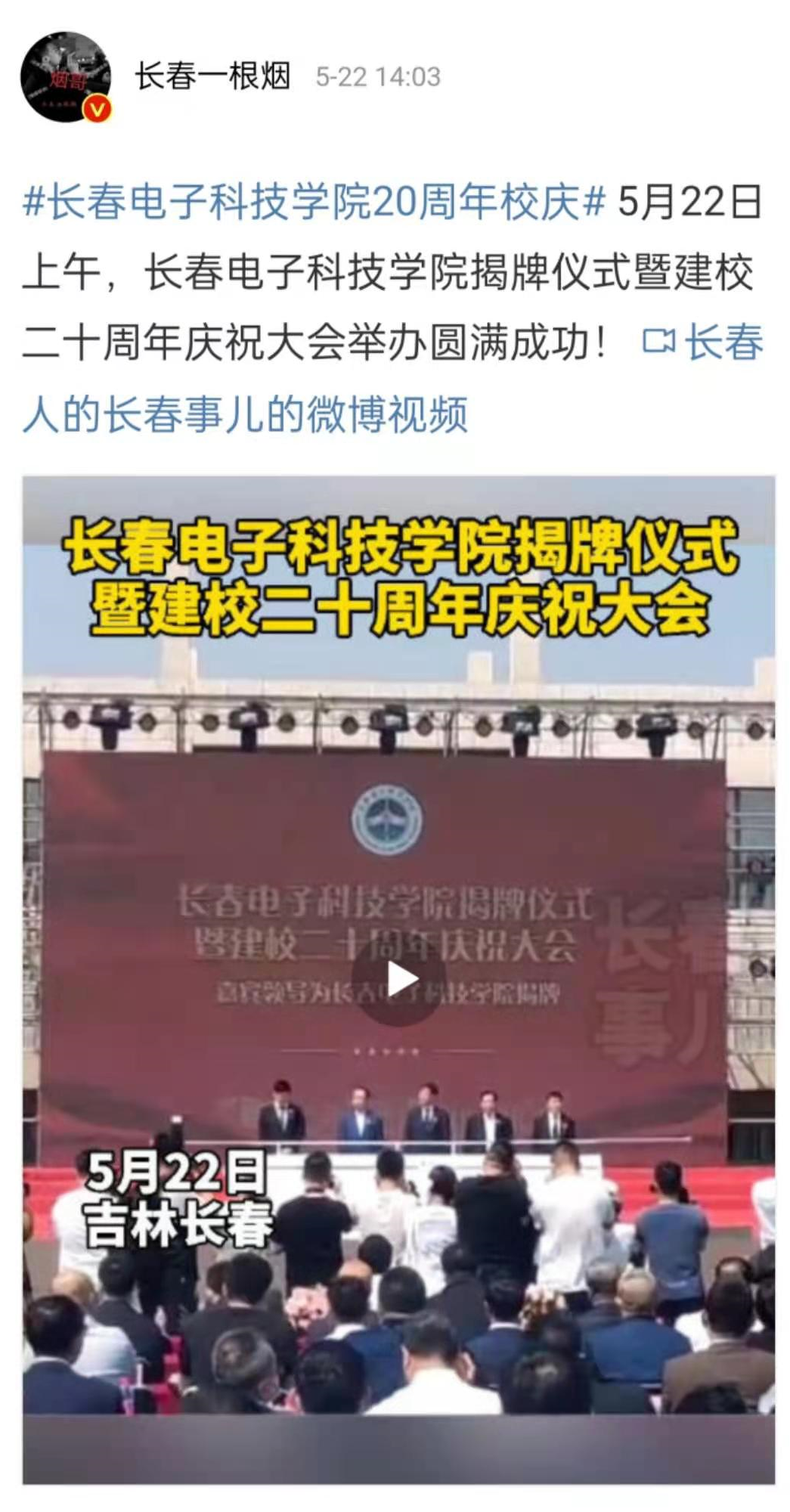 【長(zhǎng)春一根煙】5月22日上午,長(zhǎng)春電子科技學(xué)院揭牌儀式暨建校二十周年慶祝大會(huì)舉辦圓滿成功