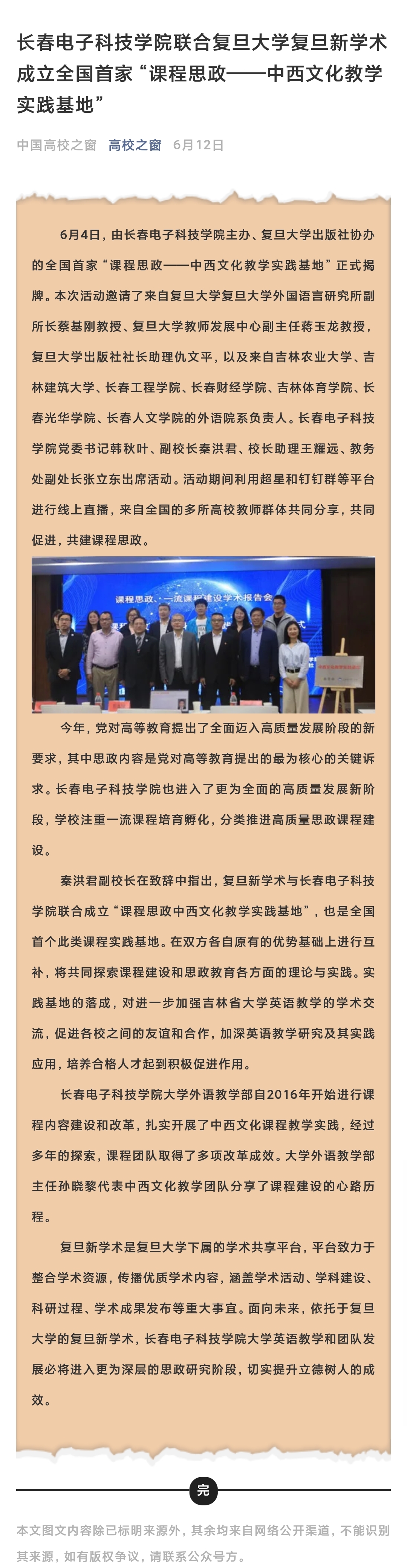【高校之窗】長春電子科技學(xué)院聯(lián)合復(fù)旦大學(xué)復(fù)旦新學(xué)術(shù) 成立全國首家“課程思政——中西文化教學(xué)實踐基地”