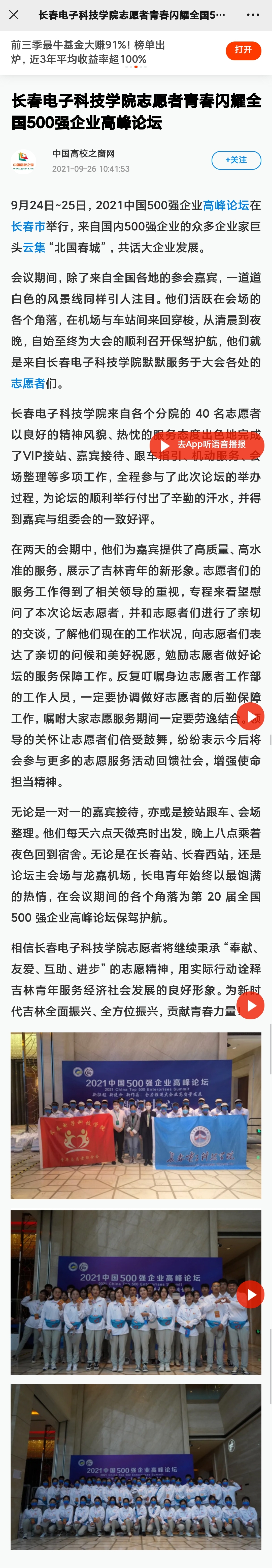 【中國高校之窗網(wǎng)】長春電子科技學院志愿者青春閃耀全國500強企業(yè)高峰論壇