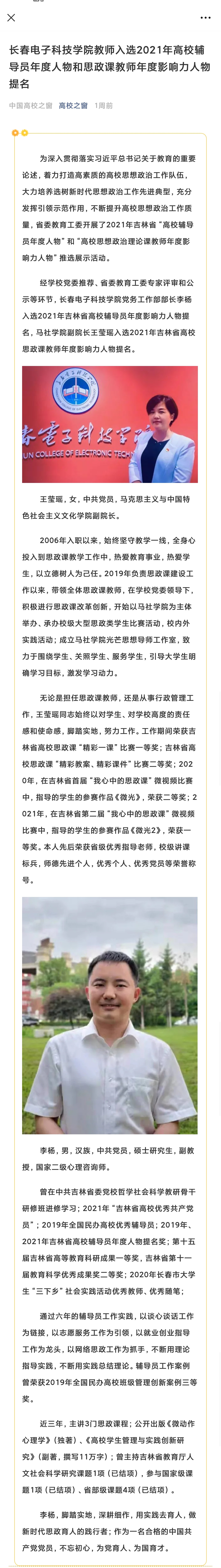 【高校之窗】長春電子科技學(xué)院教師入選2021年高校輔導(dǎo)員年度人物和思政課教師年度影響力人物提名