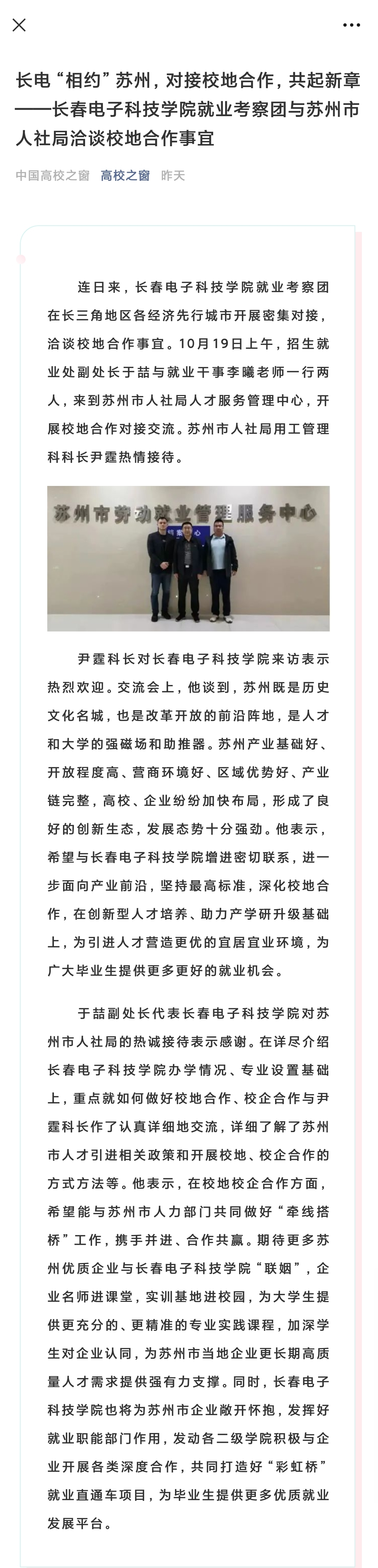【中國高校之窗】長電“相約”蘇州,對接校地合作,共起新章——長春電子科技學院就業(yè)考察團與蘇州市人社局洽談校地合作事宜