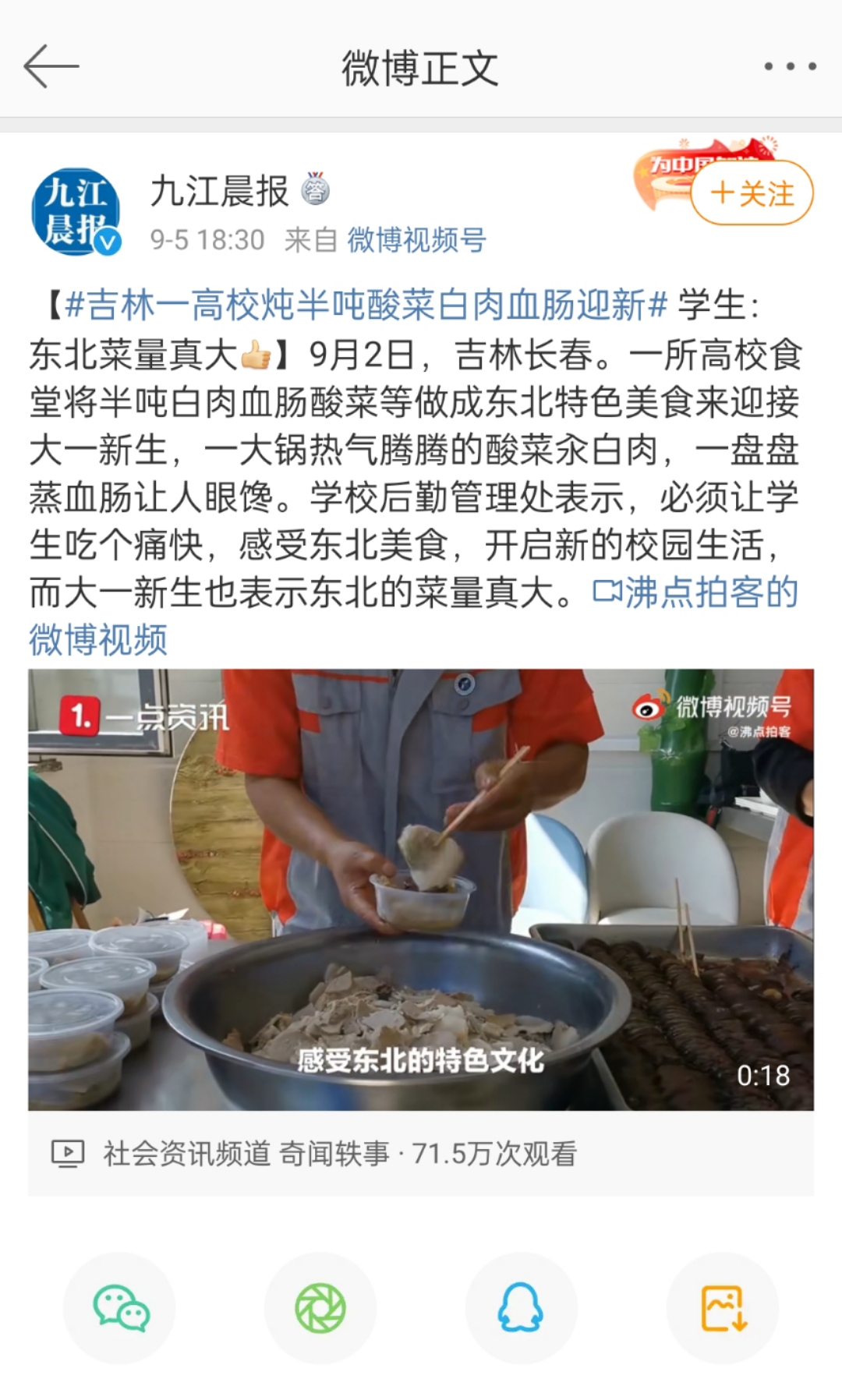 【九江晨報】#吉林一高校燉半噸酸菜白肉血腸迎新# 學(xué)生:東北菜量真大