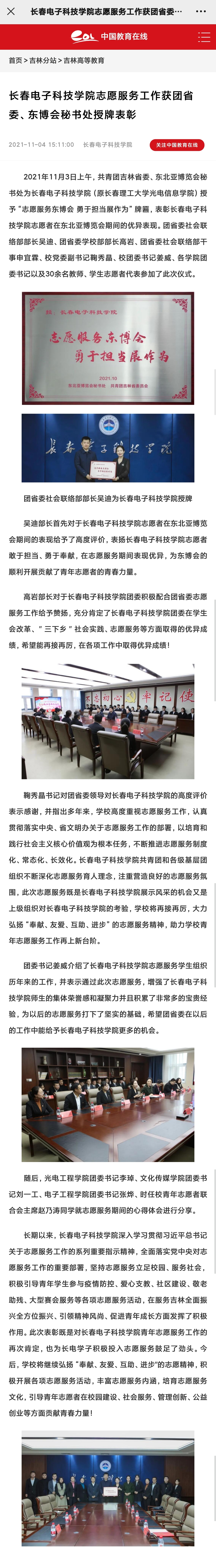 【中國(guó)教育在線】長(zhǎng)春電子科技學(xué)院志愿服務(wù)工作獲團(tuán)省委、東博會(huì)秘書處授牌表彰