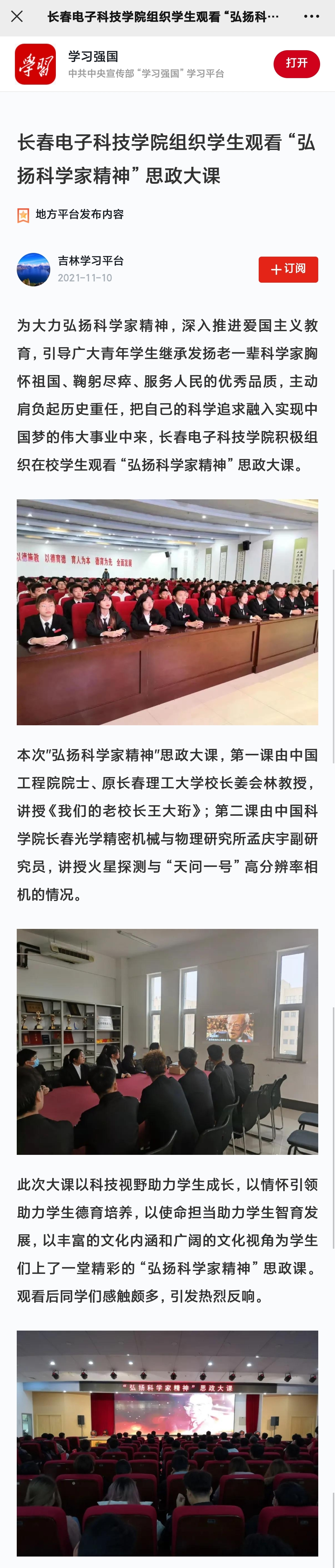 【吉林學(xué)習(xí)平臺】長春電子科技學(xué)院組織學(xué)生觀看“弘揚(yáng)科學(xué)家精神”思政大課