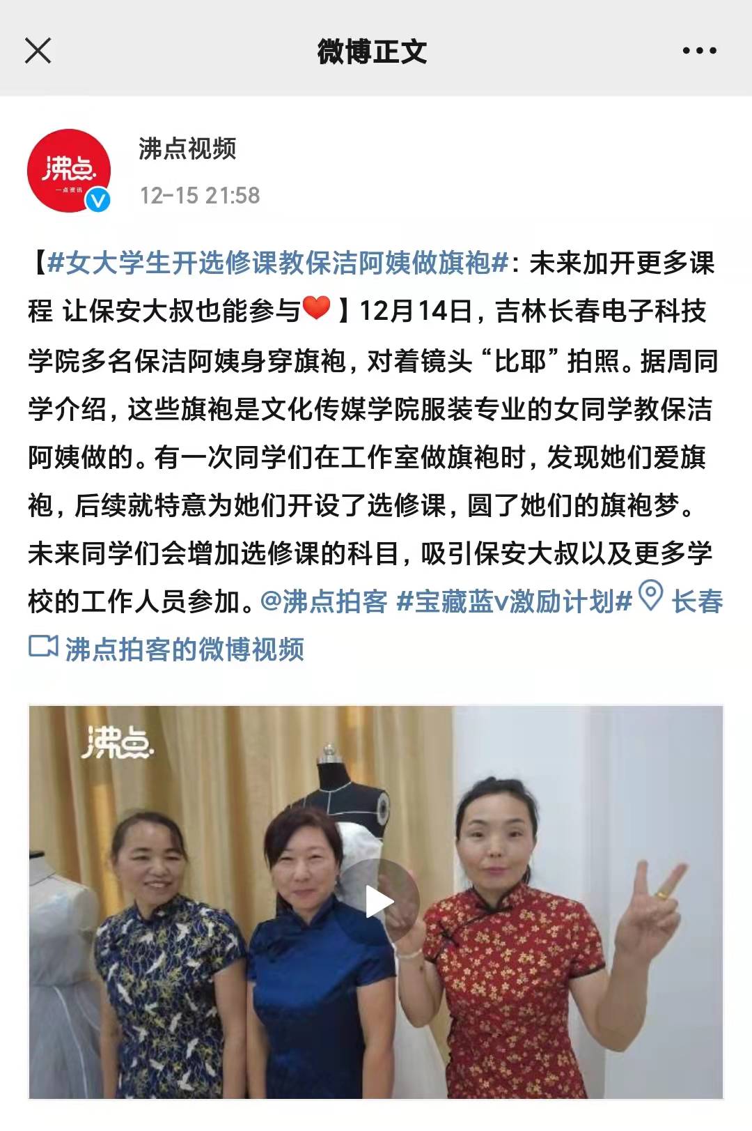【沸點(diǎn)視頻】女大學(xué)生開選修課教保潔阿姨做旗袍