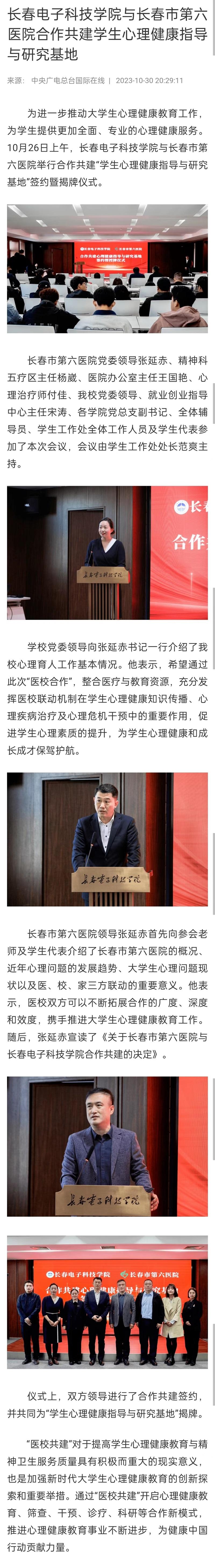 【國際在線教育】長春電子科技學(xué)院與長春市第六醫(yī)院合作共建學(xué)生心理健康指導(dǎo)與研究基地