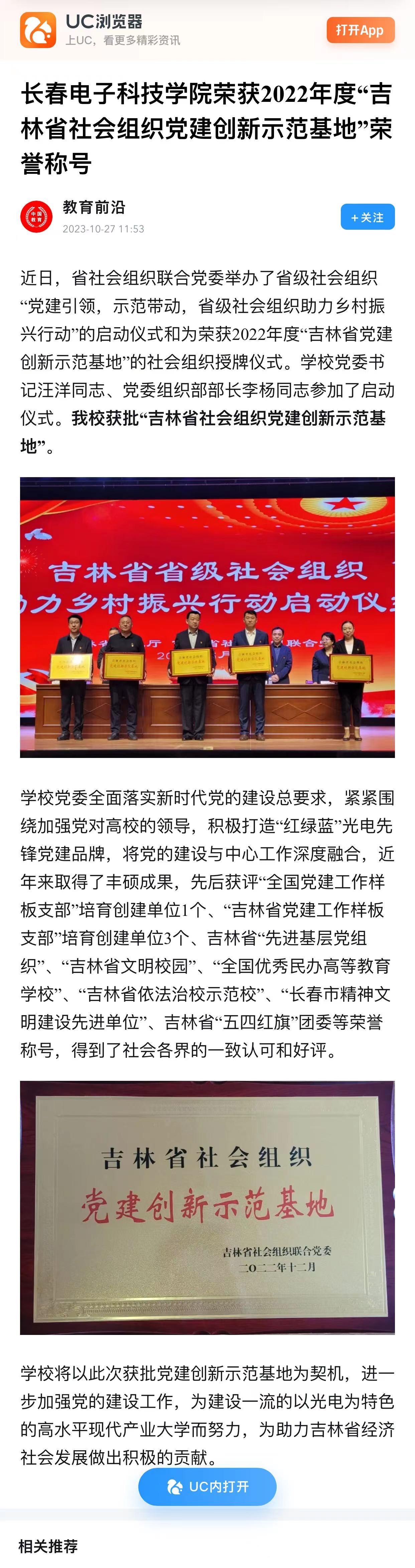 【UC】長(zhǎng)春電子科技學(xué)院獲“吉林省社會(huì)組織黨建創(chuàng)新示范基地”榮譽(yù)稱號(hào)