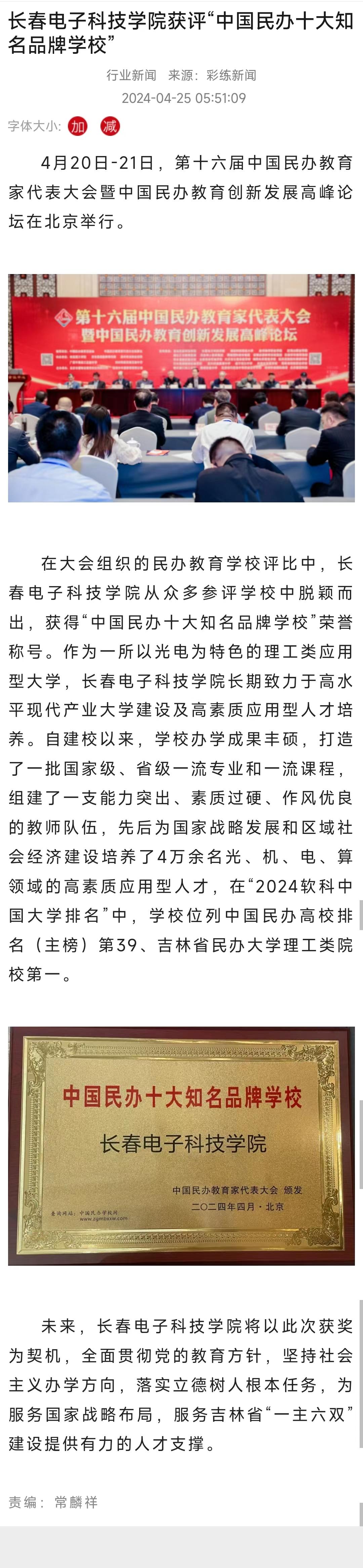 【吉林日?qǐng)?bào)】長(zhǎng)春電子科技學(xué)院獲評(píng)“中國(guó)民辦十大知名品牌學(xué)?!?/h2>