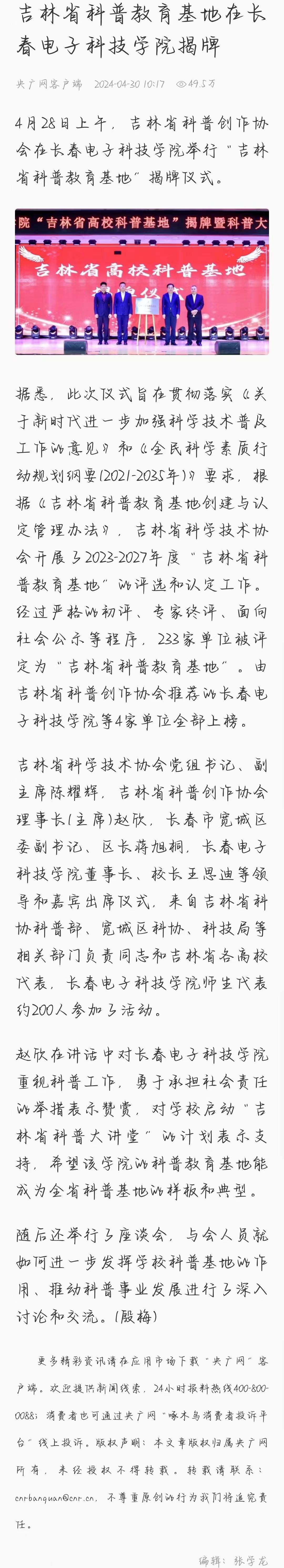 【央廣網(wǎng)客戶端】吉林省科普教育基地在長春電子科技學院揭牌