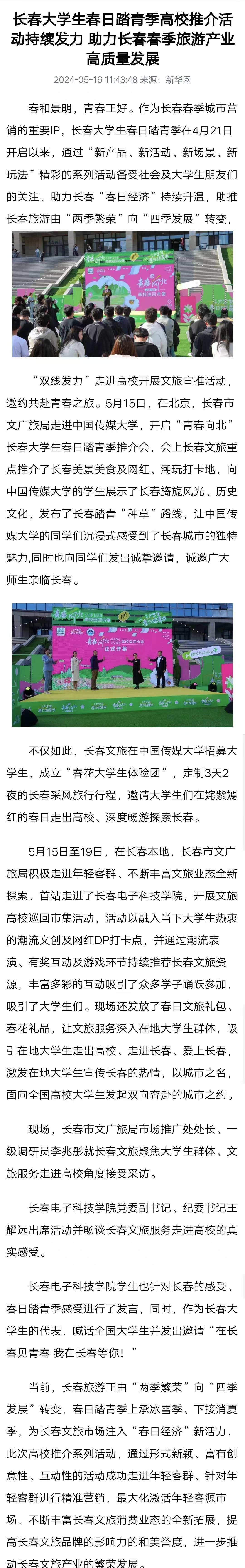 【新華網(wǎng)】長(zhǎng)春大學(xué)生春日踏青季高校推介活動(dòng)持續(xù)發(fā)力 助力長(zhǎng)春春季旅游產(chǎn)業(yè)高質(zhì)量發(fā)展