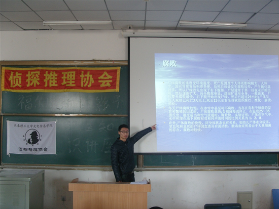 4月21日,一群推理愛(ài)好者在八教101教室展開(kāi)了法醫(yī)知識(shí)的專題講座,由推理協(xié)會(huì)的韓金格同學(xué)主講,在他的主講下,讓我們對(duì)法醫(yī)這一職業(yè)充滿敬意,他們心思縝密,細(xì)致入微。在尸體中探尋事情的始末,將尸體演繹成藝術(shù),用科學(xué)的眼光做出理智的判斷,用物質(zhì)和知識(shí)還原時(shí)間。演講者對(duì)法醫(yī)知識(shí)有著深入的研究,風(fēng)趣幽默的演講方式,對(duì)由尸斑判斷死因及其死亡時(shí)間的方法,讓在座的推理愛(ài)好者受益匪淺。尸體本就不可怕,可怕的是犯罪者的險(xiǎn)惡,若因我們對(duì)尸體的厭惡而讓死者無(wú)法昭雪,即是一個(gè)刑偵人員的罪,通過(guò)今天的講座,大家對(duì)尸體的感覺(jué)由開(kāi)始的厭惡和嫌棄逐漸變?yōu)槔硇缘呐袛嗯c分析,這是一個(gè)推理愛(ài)好者必備的素質(zhì)與修養(yǎng),也是作為一個(gè)理工科學(xué)生應(yīng)有的嚴(yán)謹(jǐn)。感謝推理協(xié)會(huì)主辦的這次講座,讓我們擴(kuò)充了知識(shí)的同時(shí)升華了思想,“真相只有一個(gè)”,望推理協(xié)會(huì)在探求真相的路上越走越遠(yuǎn)。
