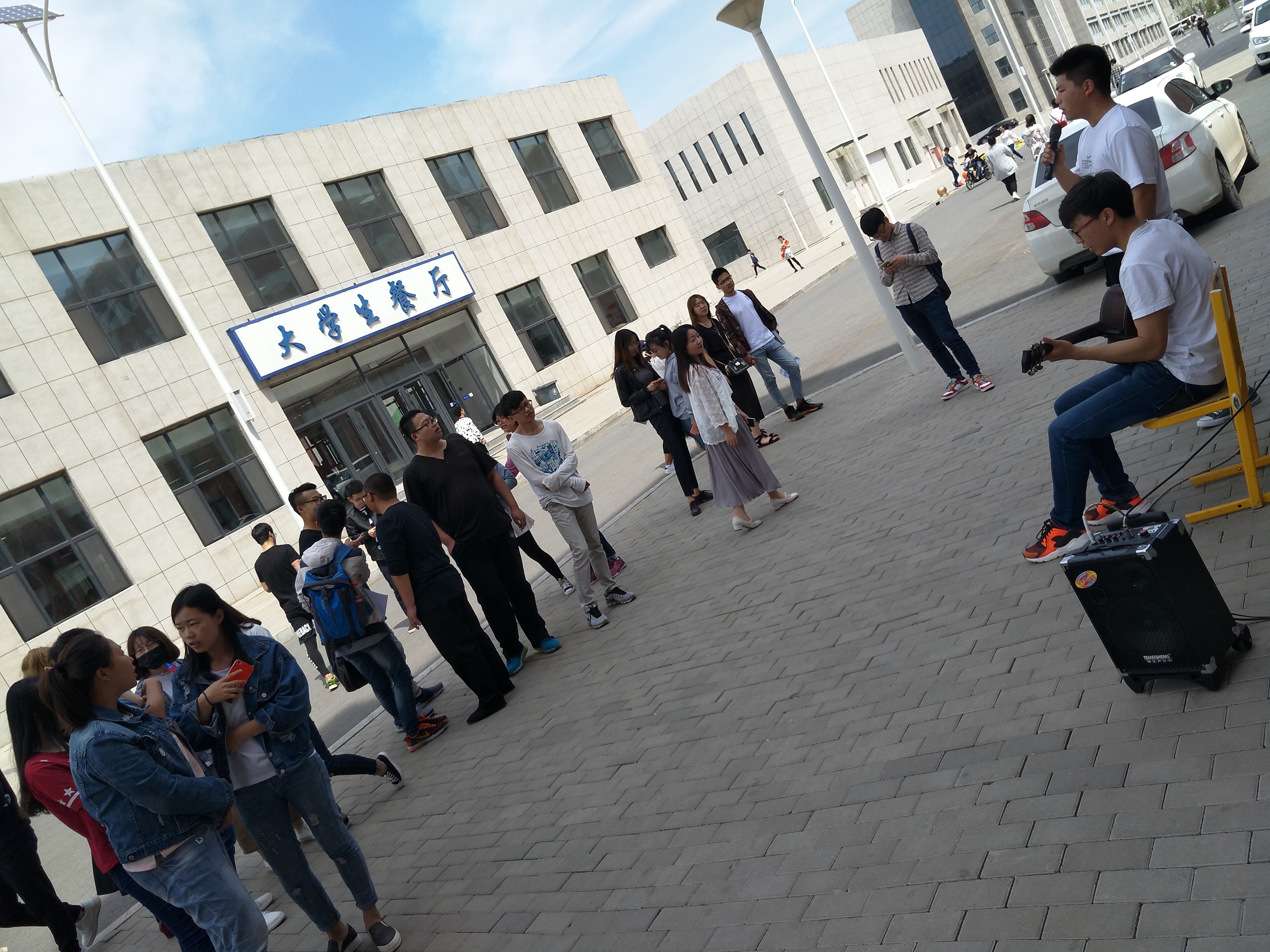 2017年5月17日中午長(zhǎng)春理工大學(xué)光電信息學(xué)院社團(tuán)聯(lián)合會(huì)吉他協(xié)會(huì)在蘭家校區(qū)食堂正門前進(jìn)行演唱。