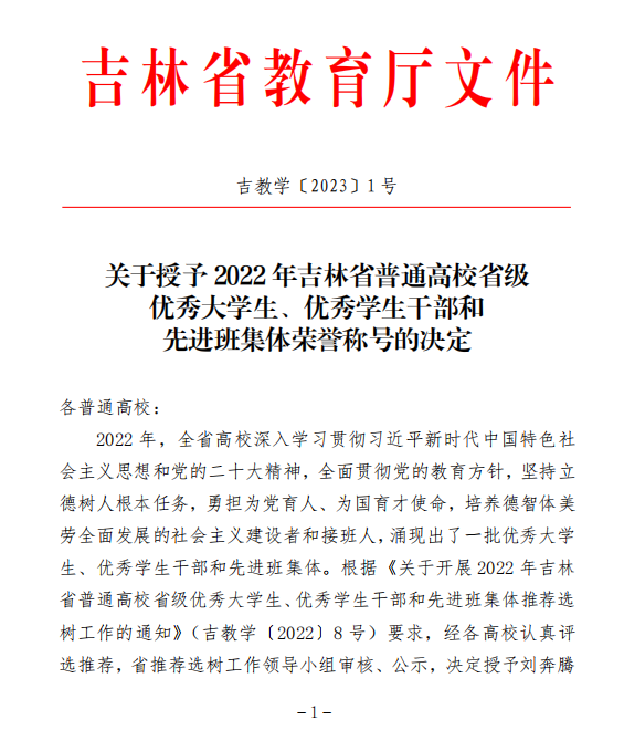 近日,吉林省教育廳開展了 2022 年吉林省普通高等學(xué)校省級優(yōu)秀大學(xué)生、優(yōu)秀學(xué)生干部和先進班集體推薦選樹工作。經(jīng)學(xué)校評選推薦、省推薦選樹工作領(lǐng)導(dǎo)小組審核、省教育廳公示,我校吳子博等 10 名同學(xué)榮獲“優(yōu)秀大學(xué)生”榮譽稱號,邊家寶等 3 名同學(xué)榮獲“優(yōu)秀學(xué)生干部”榮譽稱號,19514 班等三個班級獲得“先進班集體”榮譽稱號。