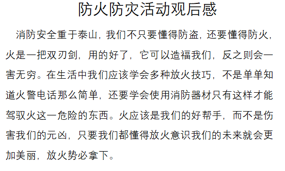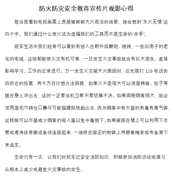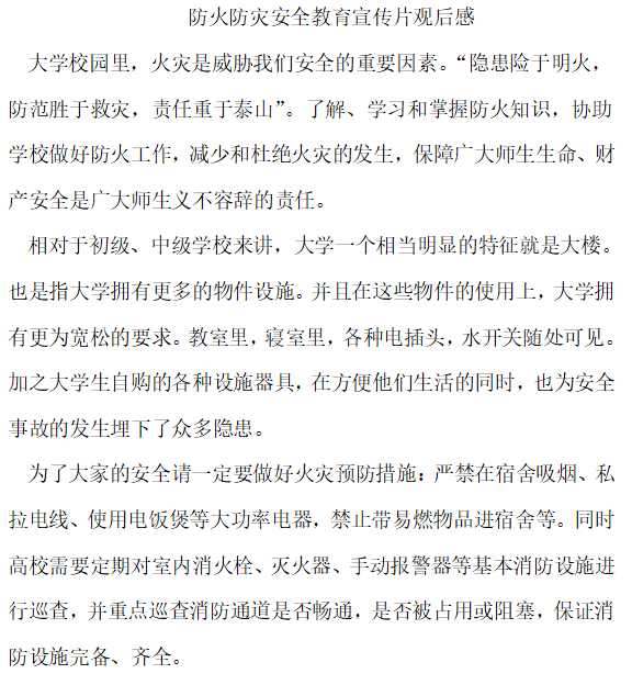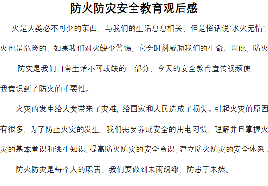 為保證校園安全,特為同學(xué)開展“觀看防火防災(zāi)安全教育宣傳片”征文活動,以保障校園安全。