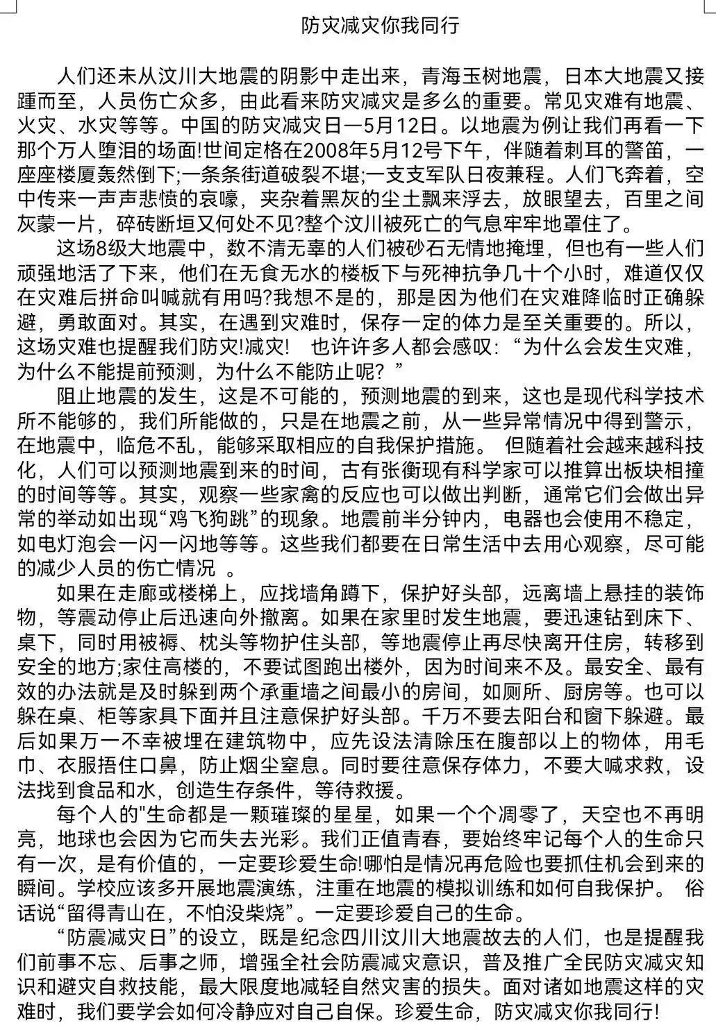 通過本次征文活動(dòng),讓同學(xué)們更加了解防災(zāi)減災(zāi)重要性, 提高安全意識(shí),掌握更多的應(yīng)急避險(xiǎn)和自救互救技巧。對(duì)危難時(shí)刻的急救與救人有了一定的了解,對(duì)生命也有了全新的詮釋。