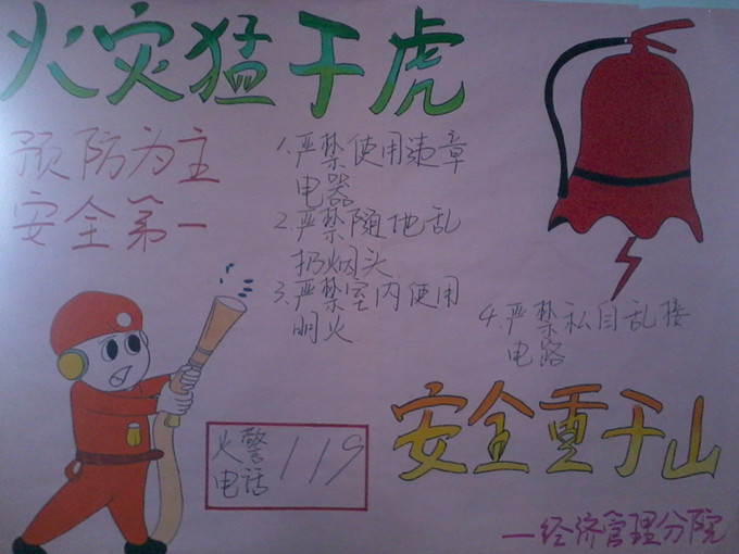 光電學院俄語學院校區(qū)男寢著火事件,引起了全校的廣泛重視。經(jīng)濟管理分院也采取了一定的措施,防范于未然。特別出了題為“火災猛于虎,安全重于山”的板報。以時刻提醒同學們防火意識。