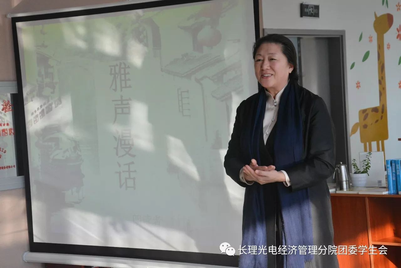 活動(dòng)的最后,我們邀請了陳洪秋女士與我們分享了讀書經(jīng)驗(yàn)。沒有松風(fēng)的秋,雁去長空;沒有飛雪的冬,乍暖還寒。一夜高風(fēng)凋碧樹,凋不了青春不滅的火焰;滿地余寒露凝香,凝不住你絕美的嗓音。