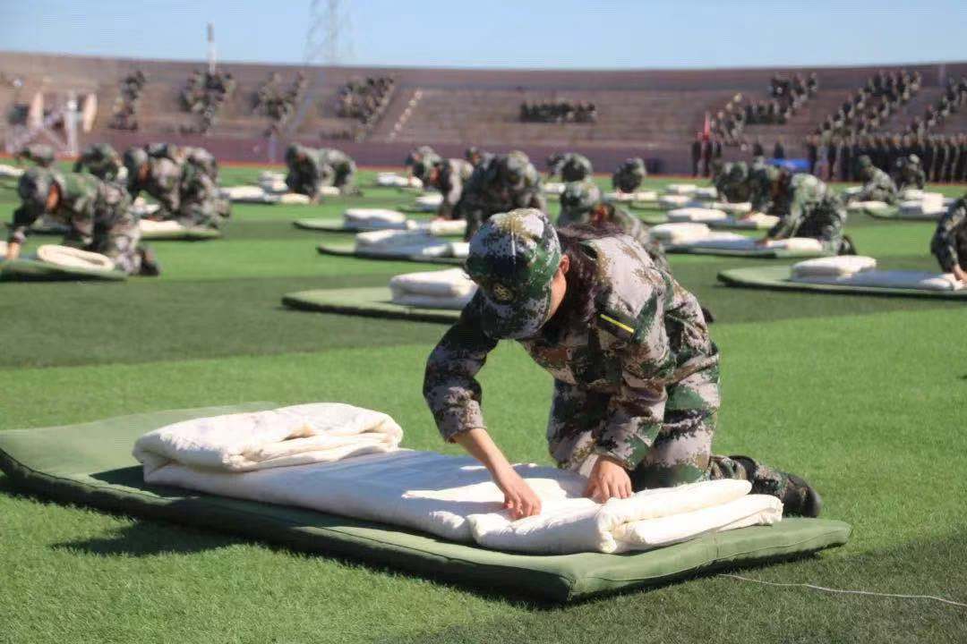 為體現(xiàn)我校良好的寢室文化環(huán)境和嚴(yán)格的寢室紀(jì)律,軍訓(xùn)期間,教官們傳遞軍隊(duì)能量,教給新生們疊被子,寢室物品擺放,在操場上,19級新生們現(xiàn)場疊被子,接受領(lǐng)導(dǎo)檢閱。