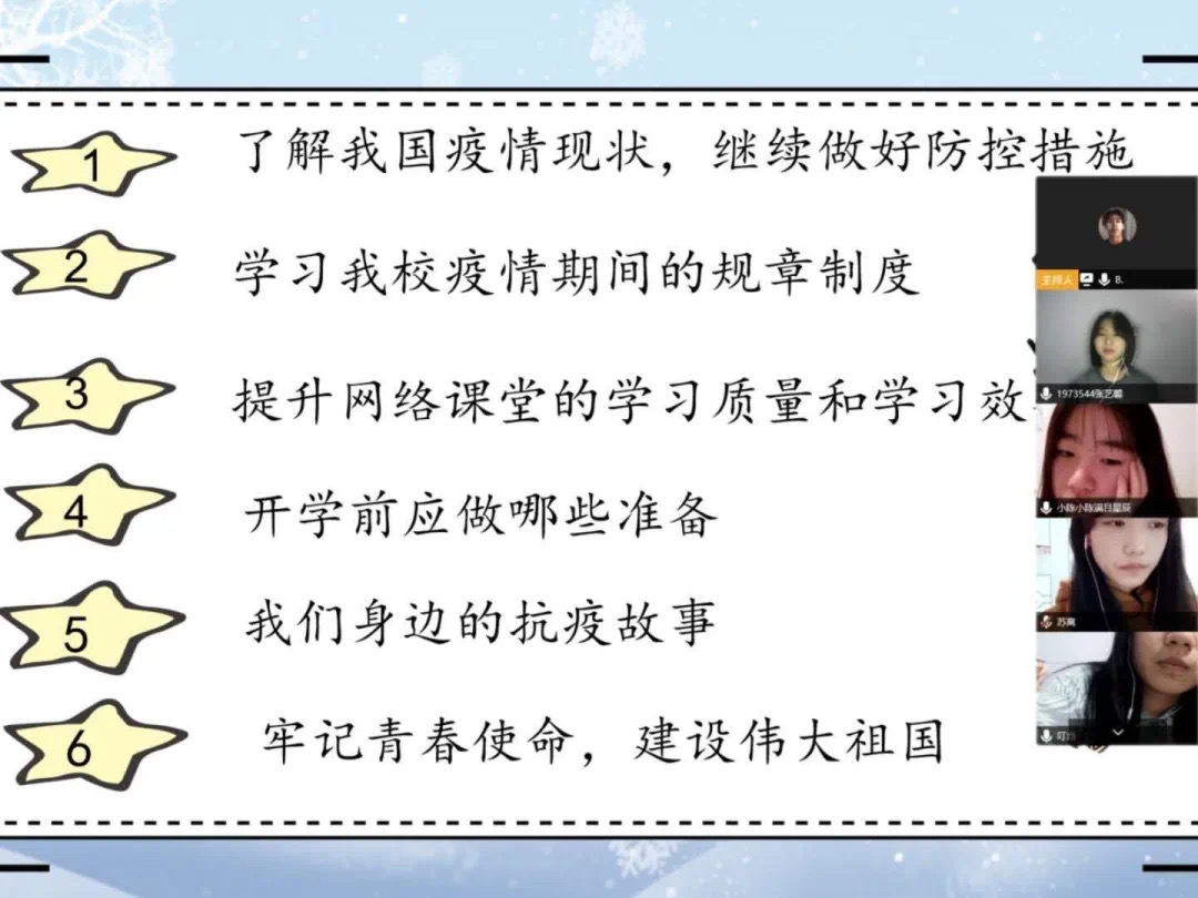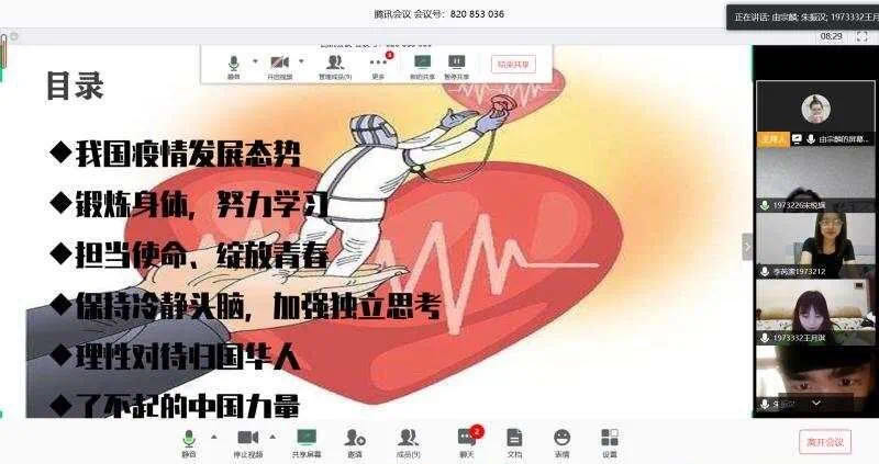 為深入貫徹落實習(xí)近平總書記關(guān)于打贏疫情防控阻擊戰(zhàn)重要指示精神,并按照學(xué)校疫情防控的戰(zhàn)略部署,進(jìn)一步增強(qiáng)大學(xué)生疫情防控的責(zé)任意識。為了加強(qiáng)疫情防控期間學(xué)生的日常管理,將疫情防控工作落實落細(xì),做好疫情期間思想政治教育、疫情知識教育、養(yǎng)成教育、安全教育等工作,綜合同學(xué)們的實際情況,商學(xué)院全體輔導(dǎo)員組織學(xué)生召開相關(guān)主題班會。分院全體輔導(dǎo)員組織同學(xué)們通過騰訊會議、QQ群、微信群、釘釘app等網(wǎng)絡(luò)平臺,開展了涵蓋疫情知識在線競答、在線觀看防疫科普視頻、群內(nèi)圖文分享等內(nèi)容豐富多彩的主題班會。