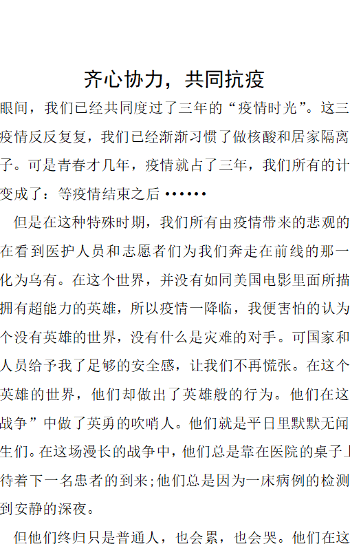 為配合學校工作,表示全院師生抗疫決心,我院團委學習部大力傳達和引導,各班積極響應,通過線上方式,組織學生寫作上交。經(jīng)院學習部進行不斷篩選,給予評價,選出了最為符合本次征文活動的作品進行參賽。