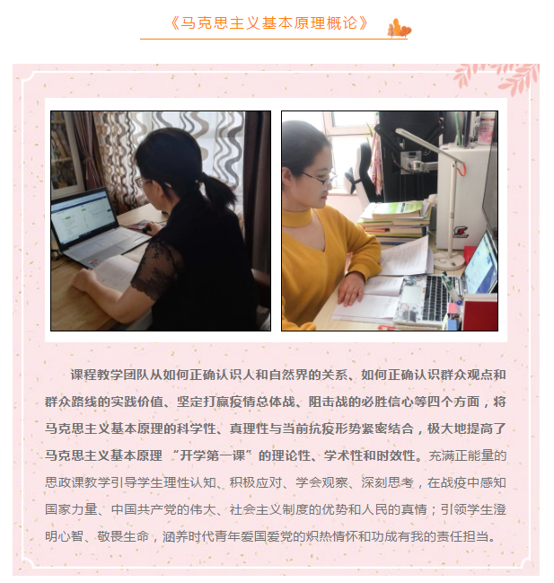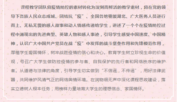 在這場(chǎng)看不見(jiàn)對(duì)手、沒(méi)有硝煙的戰(zhàn)爭(zhēng)中,在普通的教學(xué)崗位上,馬社學(xué)院全體教師以傳遞戰(zhàn)勝疫情的堅(jiān)定信心、講述動(dòng)人心弦的真實(shí)故事、展現(xiàn)新時(shí)代的中國(guó)力量為己任,精心準(zhǔn)備,精細(xì)打磨,以當(dāng)前疫情防控為主題結(jié)合四門(mén)思政課各自內(nèi)容和特點(diǎn),對(duì)學(xué)生進(jìn)行愛(ài)國(guó)主義教育、集體主義教育、理想信念教育和社會(huì)主義核心價(jià)值觀教育,彰顯了社會(huì)主義制度優(yōu)勢(shì),引導(dǎo)學(xué)生增強(qiáng)“四個(gè)意識(shí)”,堅(jiān)定“四個(gè)自信”做到“兩個(gè)維護(hù)”,增強(qiáng)了學(xué)生們對(duì)疫情防控的必勝信心。