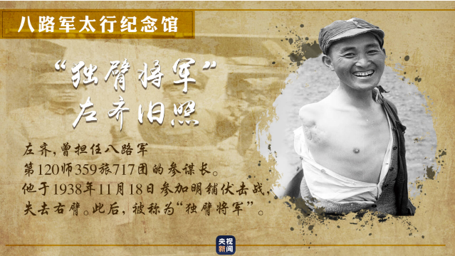 一張獨(dú)臂將軍的舊照,展現(xiàn)出八路軍為爭(zhēng)取民族獨(dú)立,不怕?tīng)奚⒉晃菲D險(xiǎn)的革命英雄主義精神。