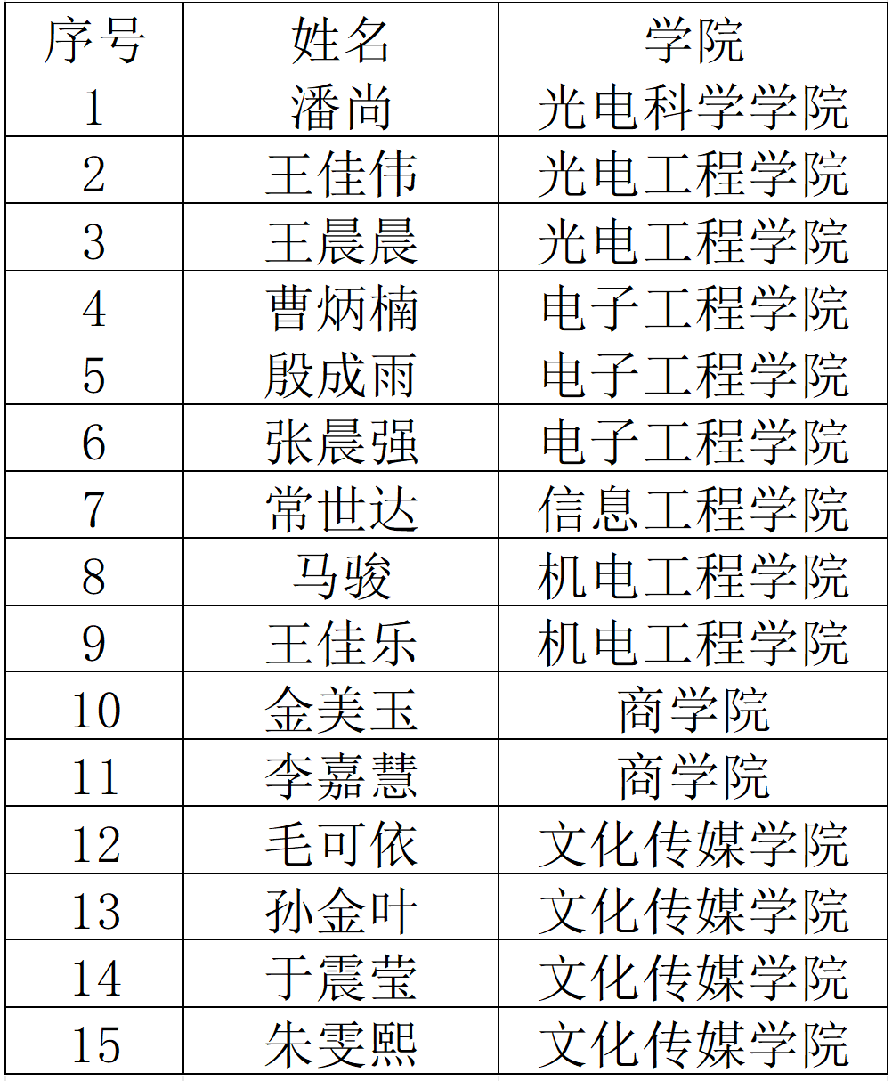 王晨晨等15位同學(xué)成為2022-2023學(xué)年長(zhǎng)春電子科技學(xué)院國(guó)家獎(jiǎng)學(xué)金人選,公示名單如下。