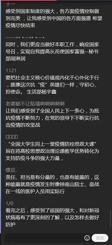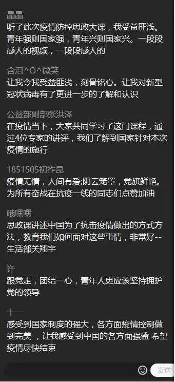 2020年3月15日,我院團(tuán)委書記陳秀敏老師關(guān)于全院同學(xué)觀看防控疫情思政大課后的所感所悟,召開了一次線上會(huì)議,在會(huì)議中陳老師指出,在2020這個(gè)對(duì)于“中華民族偉大復(fù)興”至關(guān)重要的時(shí)間節(jié)點(diǎn),我們年輕人更應(yīng)該承擔(dān)起作為青年人的責(zé)任,挺起屬于中國(guó)青年的脊梁。