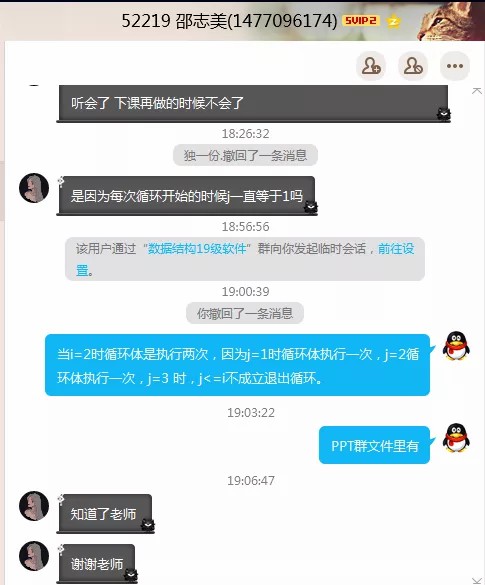 對(duì)于個(gè)別家在農(nóng)村,網(wǎng)絡(luò)信號(hào)的不好的學(xué)生要重點(diǎn)關(guān)注因?yàn)椤稊?shù)據(jù)結(jié)構(gòu)》這門課程是教研的專業(yè)課,有大三學(xué)生想在線上跟著再學(xué)一遍,我把學(xué)生拉到19級(jí)的上課群,并隨時(shí)進(jìn)行線上輔導(dǎo)。